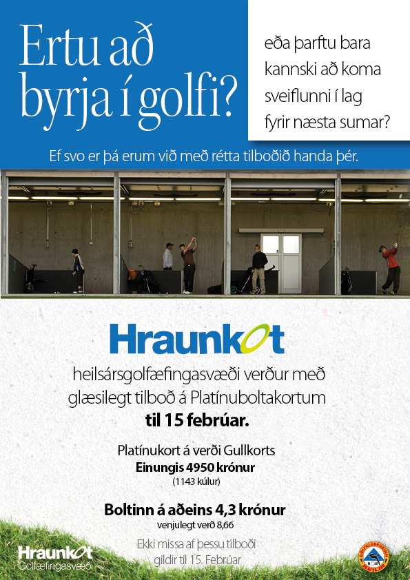 Núna er tíminn til að slá í gegn með Hraunkoti golfæfingasvæði. Í dag hófst glæsilegt tilboð á Platínukorti hjá Hraunkoti. Hraunkot mun bjóða til 15. febrúar Platínukort á verði Gullkorts. Fyrir einungis 4.950 kr fást því 1134 boltar eða sama boltamagn og er á Platínukorti. Kúlan er þá að kosta 4,3 kr en venjulegt verð er 8,66 kr [...]