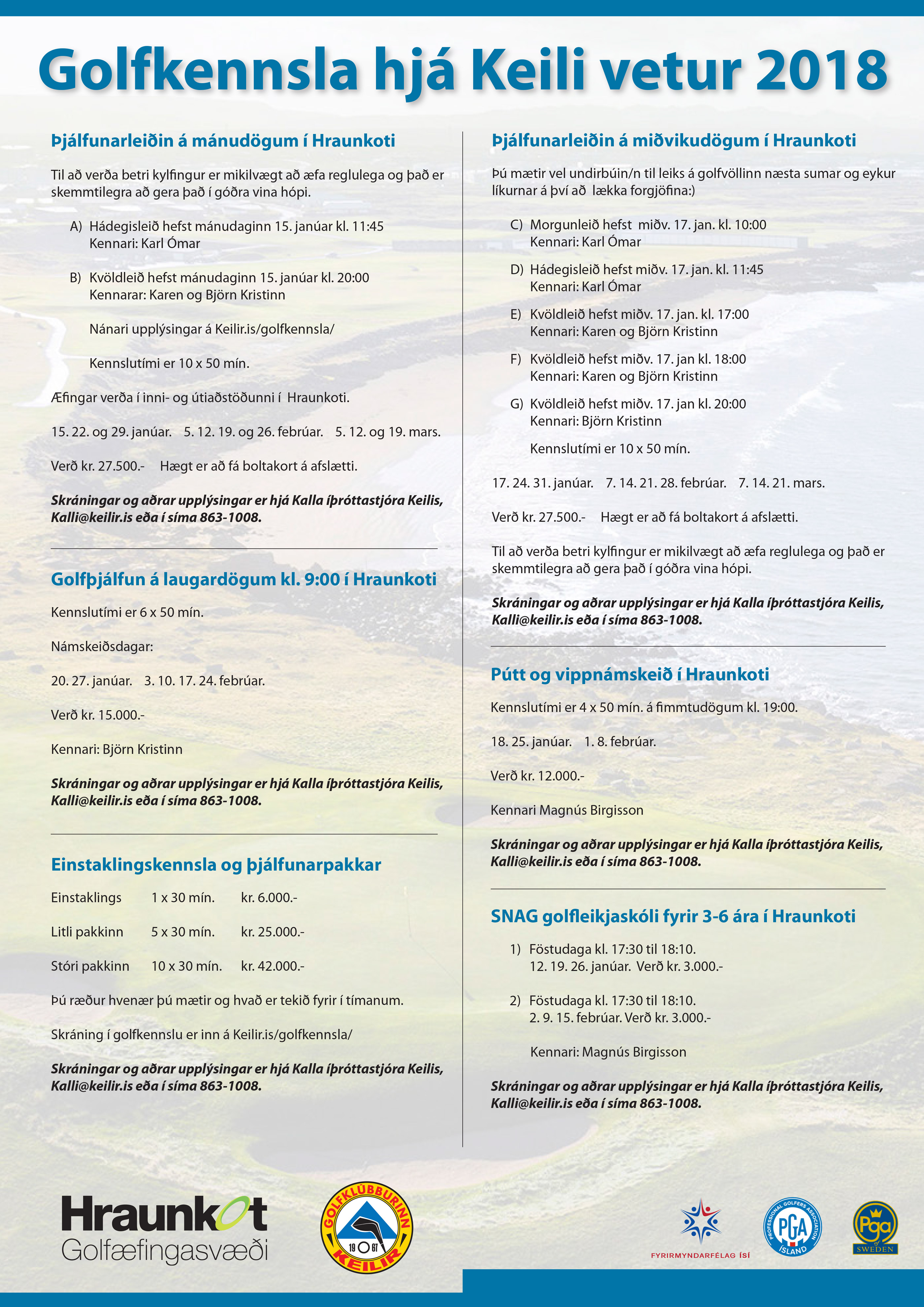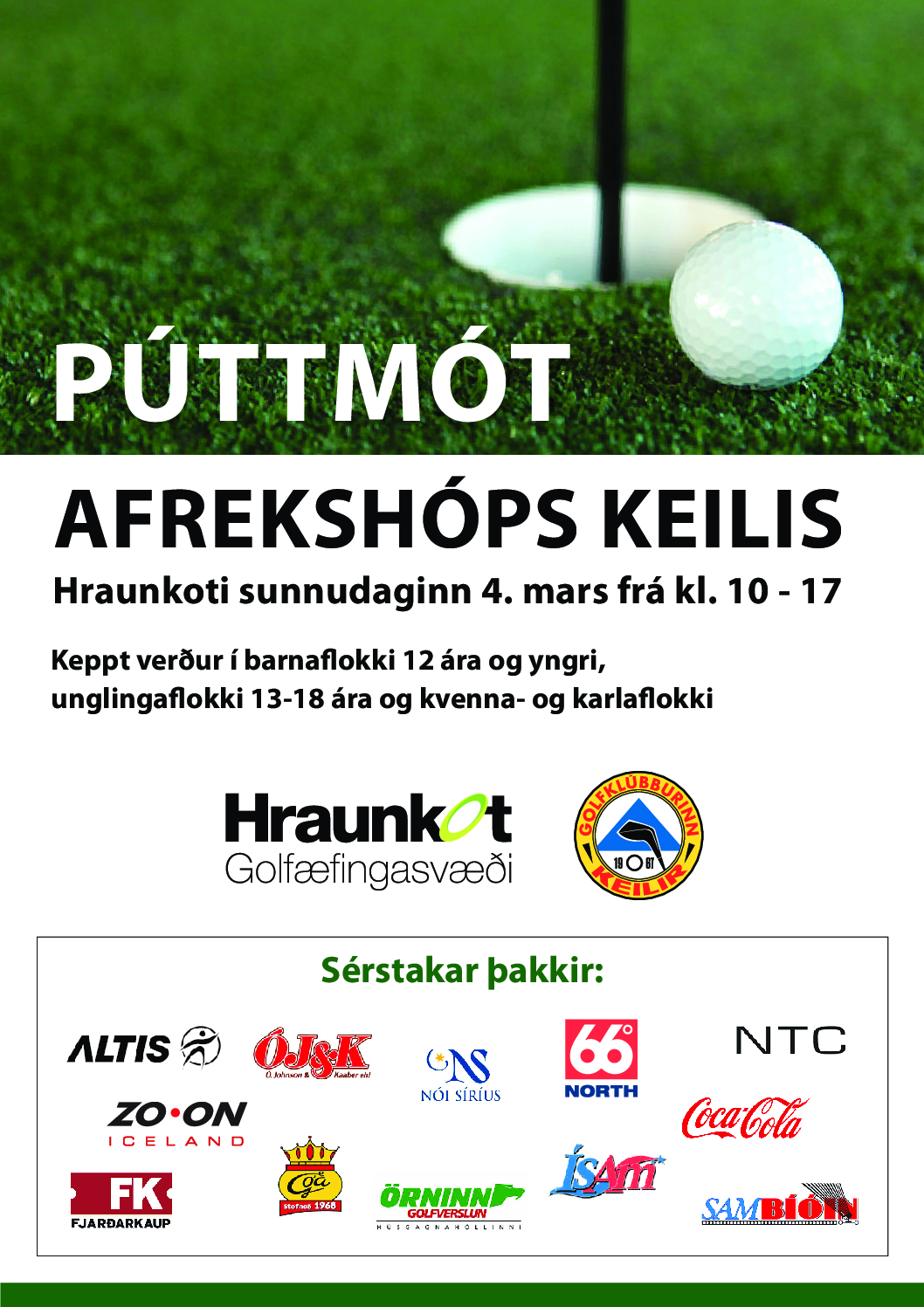 Púttmót til styrktar æfingaferðar afreks og afreksefnahóps Keilis verður sunnudaginn 4. mars frá kl. 10.00 til 17.00 í Hraunkotinu. Keppt er í flokki 12 ára og yngri, unglingaflokki 13 til 18 ára og í kvenna- og karlaflokki. Leiknir eru 3x12 holur. Allir sem pútter geta valdið eru velkomnir. Mótsgjald er 500 kr. fyrir þau yngstu (12 [...]