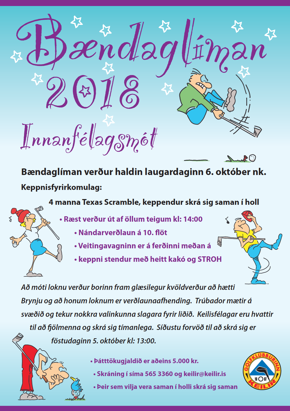 Hér munu birtast úrslit úr Bridgekvöldunum. Spilað er Bridge á hverju miðvikudagskvöldi í golfskálanum og hefjast kvöldin klukkan 19:15. Félagsmenn eru kvattir til að taka með sér gesti. Hér koma úrslitin: Bridge_úrslit_31/10/2018 Bridge úrslit_07/11/2018 Bridge úrslit_14/11/2018 Bridge úrslit 21/11/2018
