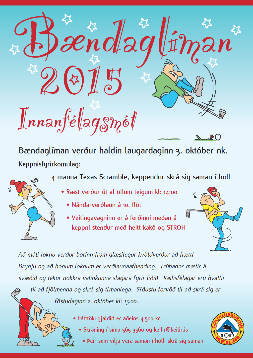 Bændaglíman verður haldin laugardaginn 3. október nk. Keppnisfyrirkomulag: 4 manna Texas Scramble, keppendur skrá sig saman í holl • Ræst verður út af öllum teigum kl: 14:00 • Nándarverðlaun á 10. flöt Veitingavagninn er á ferðinni meðan á keppni stendur með heitt kakó og STROH. Að móti loknu verður borinn fram glæsilegur kvöldverður að hætti Brynju [...]