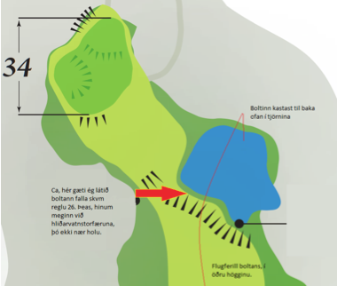 Hliðarvatnstorfæra, Regla 26 Öll þekkjum við vatnstorfærurnar, og eitt þar mörgum stundum við boltaleit eða við pælingar hvernig sé best að bera sig að við lausnir. Vatnstorfærur eru annað hvort skilgreindar sem vatnstorfæra (GUL) eða hliðarvatnstorfæra (RAUÐ). Í gulu torfærunum höfum við þrjá valkosti. Fjarlægðarvíti, boltanum leikið aftur þar sem hann lá síðast. (látinn falla eins [...]