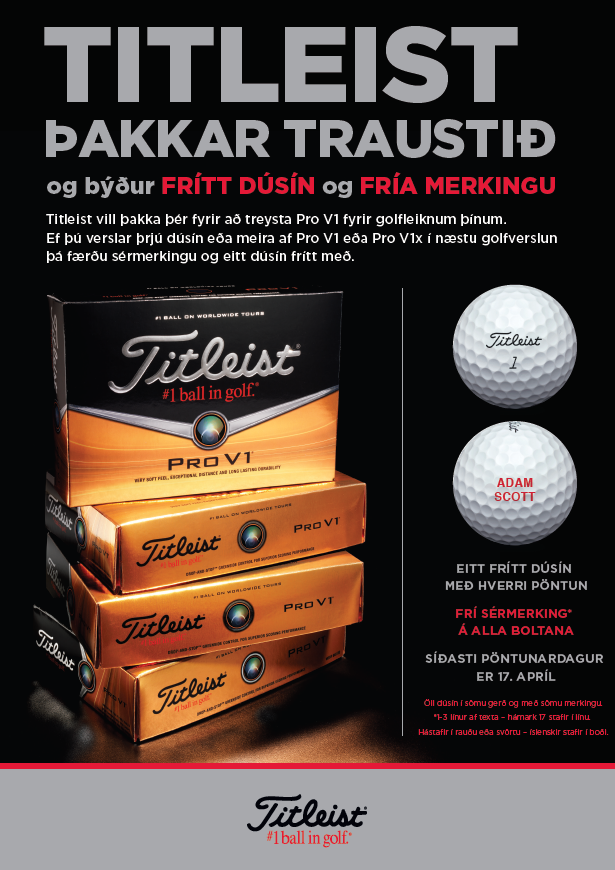Árlegt vortilboð á Titleist Pro V1 og Pro V1x er komið í gang hjá okkur. Þú verslar hjá okkur þrjú dúsín af annað hvort Titleist Pro V1 eða Pro V1x, (ekki hægt að blanda), og færð fjórða dúsínið frítt með í kaupbæti.Frí merking er innifalin. Allir boltarnir verða að vera merktir, (sjá nánar hér að neðan). Hægt [...]