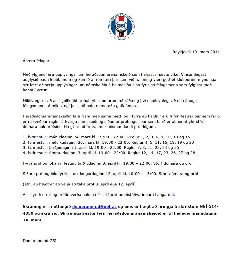 Mikilvægt er að allir golfklúbbar hafi yfir dómurum að ráða og því nauðsynlegt að efla áhuga félagsmanna á mikilvægi þess að hafa menntaða golfdómara. Héraðsdómaranámskeiðin fara fram með sama hætti og í fyrra að haldnir eru 4 fyrirlestrar þar sem farið er í ákveðnar reglur á hverju námskeiði og síðan er prófdagur þar sem farið er [...]