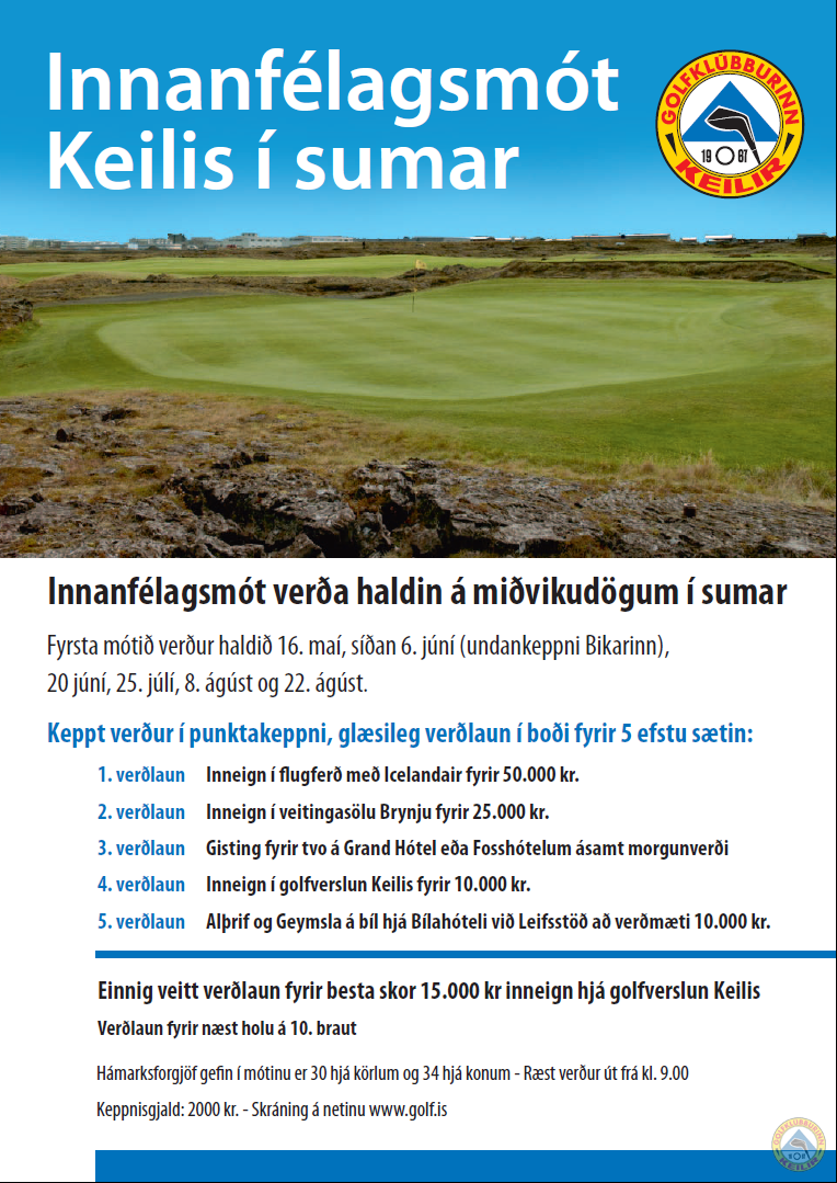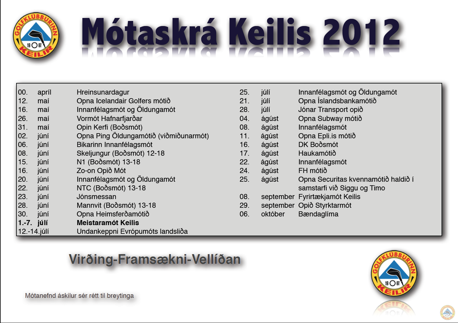 Þá er komið að fyrsta Innanfélagsmóti Keilis á árinu 2012. Vinsamlegast smellið á mynd til að sjá auglýsinguna. Það verður haldið n.k miðvikudag, ræst er út frá kl 09:00 til kl 17:30. Hámarksforgjöf karla er 30 og hámarksforgjof kvenna 34. Veðurspáin er ágæt og því tilvalið að tryggja sér rástíma sem fyrst. Einungis verða 6 Innafélagsmót [...]