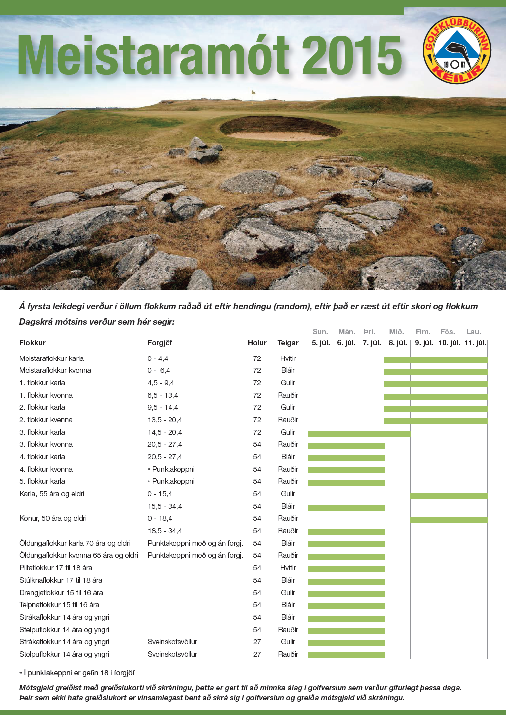 Þá er kominn tími að skipuleggja sumarið, svona til að hafa það á hreinu þá verður okkar skemmtilega meistaramót haldið dagana 5-11 júlí í blíðskaparveðri. Hér eru upplýsingar frá því í fyrra um rástíma og tímaáætlun. http://keilir.is/meistaramot-keilis-2014/ Gera má ráð fyrir því að mótið verði með svipuðu lagi og síðustu ár. Enn ef einhverjar tillögur eru [...]