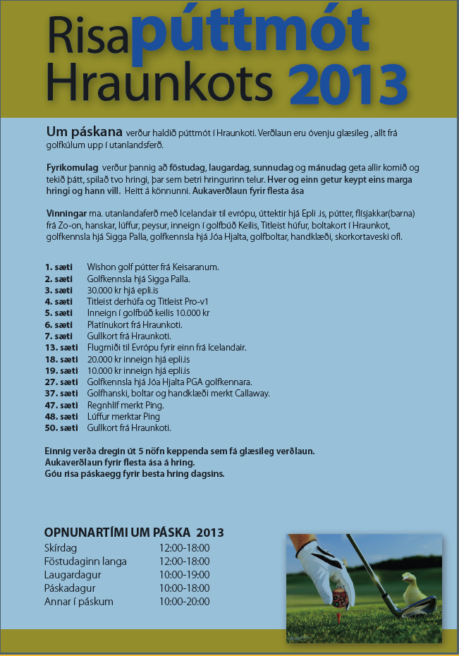 Risapúttmót Hraunkots 2013 Um páskan verður haldið púttmót í Hraunkoti.Verðlaun eru óvenju glæsileg , allt frá golfkúlum uppí utanlandsferð. Fyrikomulag verður þannig að föstudag,laugardag,sunnudag og mánudag geta allir komið og tekið þátt,spilað tvo hringi ,þar sem betri hringurinn telur . Hver og einn getur keypt eins marga hringi og hann vill.Heitt á könnunni. Aukaverðlaun fyrir flesta [...]