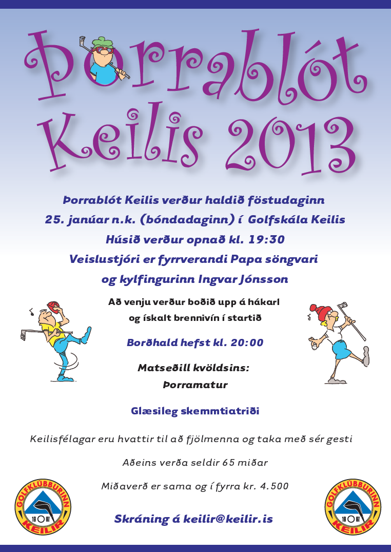 Þá er komið að hinu árlega Þorrablóti Keilis. Blótsstjóri í ár verður enginn annar enn Ingvar Jónsson áður söngvari hinnar geysivinsælu hljómsveitar Papar og snarvilltur kylfingur, já það er rétt hann Ingvar hefur ekki hitt braut í upphafshöggi frá því hann var 12 ára....Enn reynir þó. Maturinn einsog áður kemur frá Múlakaffi og verður boðið uppá [...]